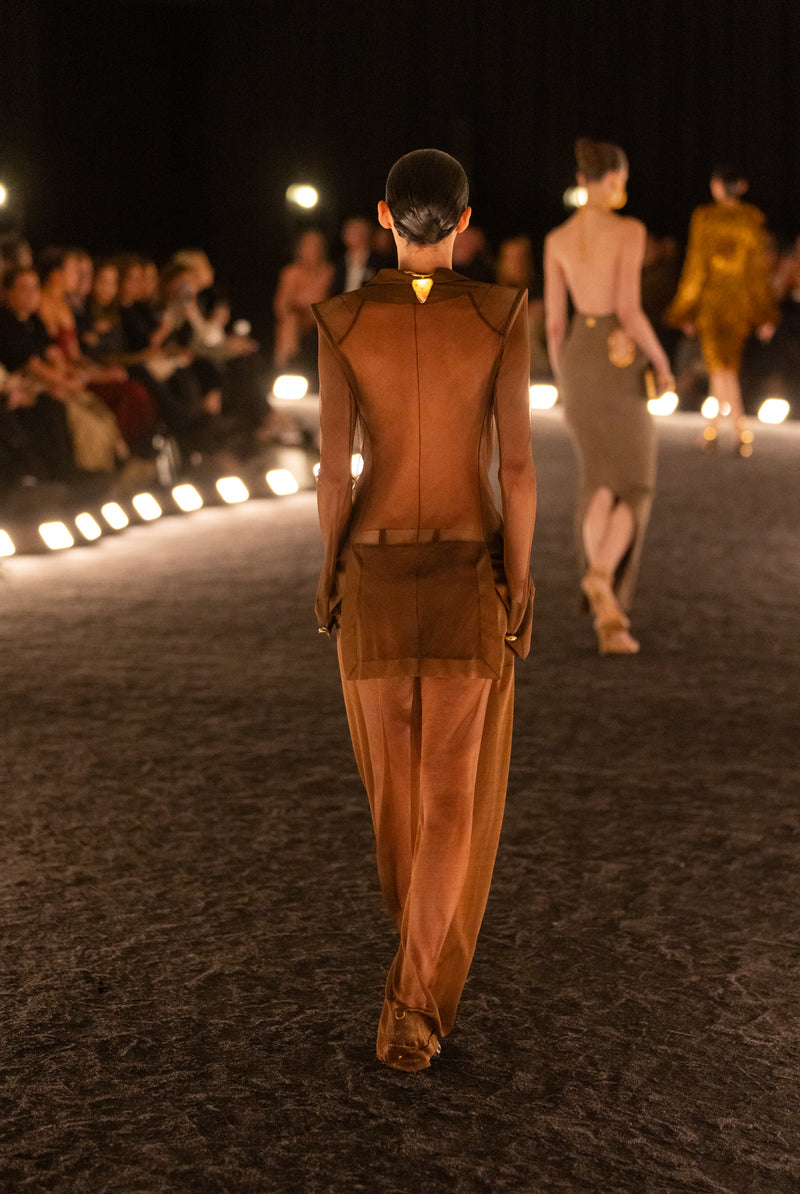Veste drapée en jersey transparent marron fumé dont le volume croisé et ramassé est retenu sur la gauche par un bouton bijou doré. Elle est portée sur un pantalon oversize à pinces assorti. Collier jonc avec succession de pierres de sel qui s’illuminent. Bottines derby en cuir noir tressé à la main au détail de laçage corset et décorées d’œillets bijoux dépareillés en métal doré et strass et d’un petit talon évoquant un soleil.