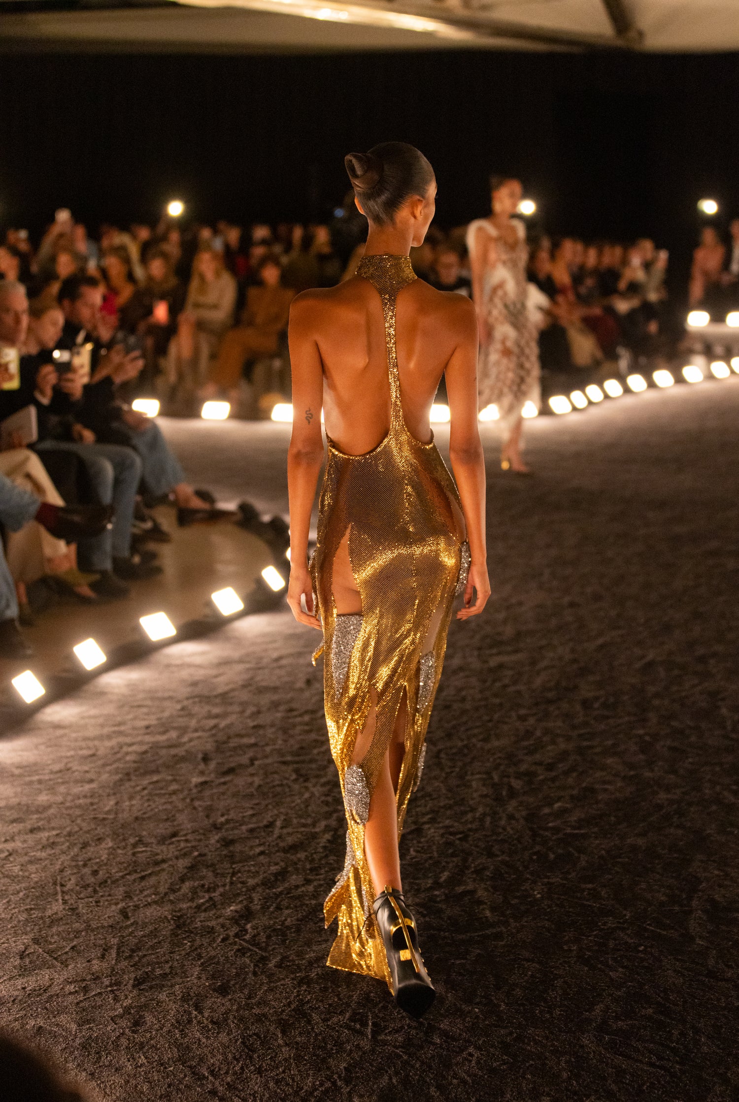 Longue robe à dos nageur en maille métallisée dorée ornée de lambeaux de tissu en trompe-l’œil dont l’envers est brodé de cristaux. Cette robe est inspirée de la robe « Lambeaux de peau » de la collection Cirque de 1938 de la Maison imaginée en collaboration avec le peintre surréaliste Salvador Dali. Bottines en cuir noir ouvertes rehaussées d’œillets bijoux dépareillés en métal doré et strass et d’un talon incurvé en métal doré finissant par une main.