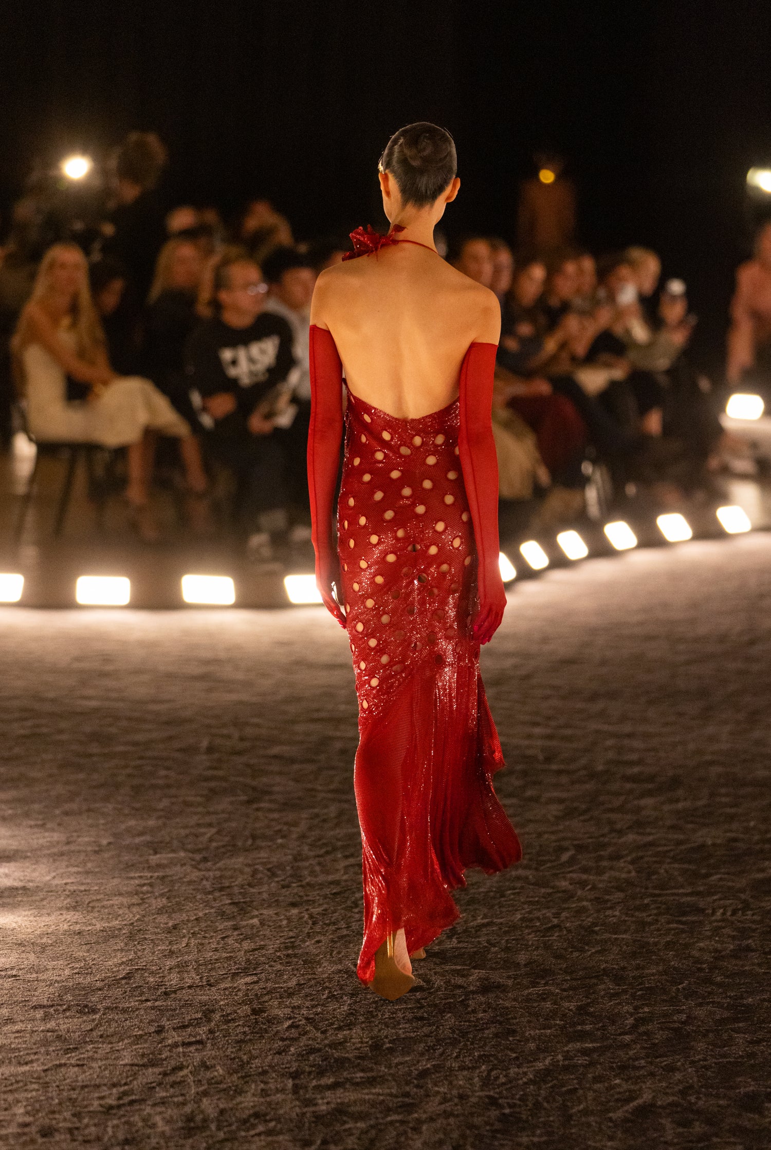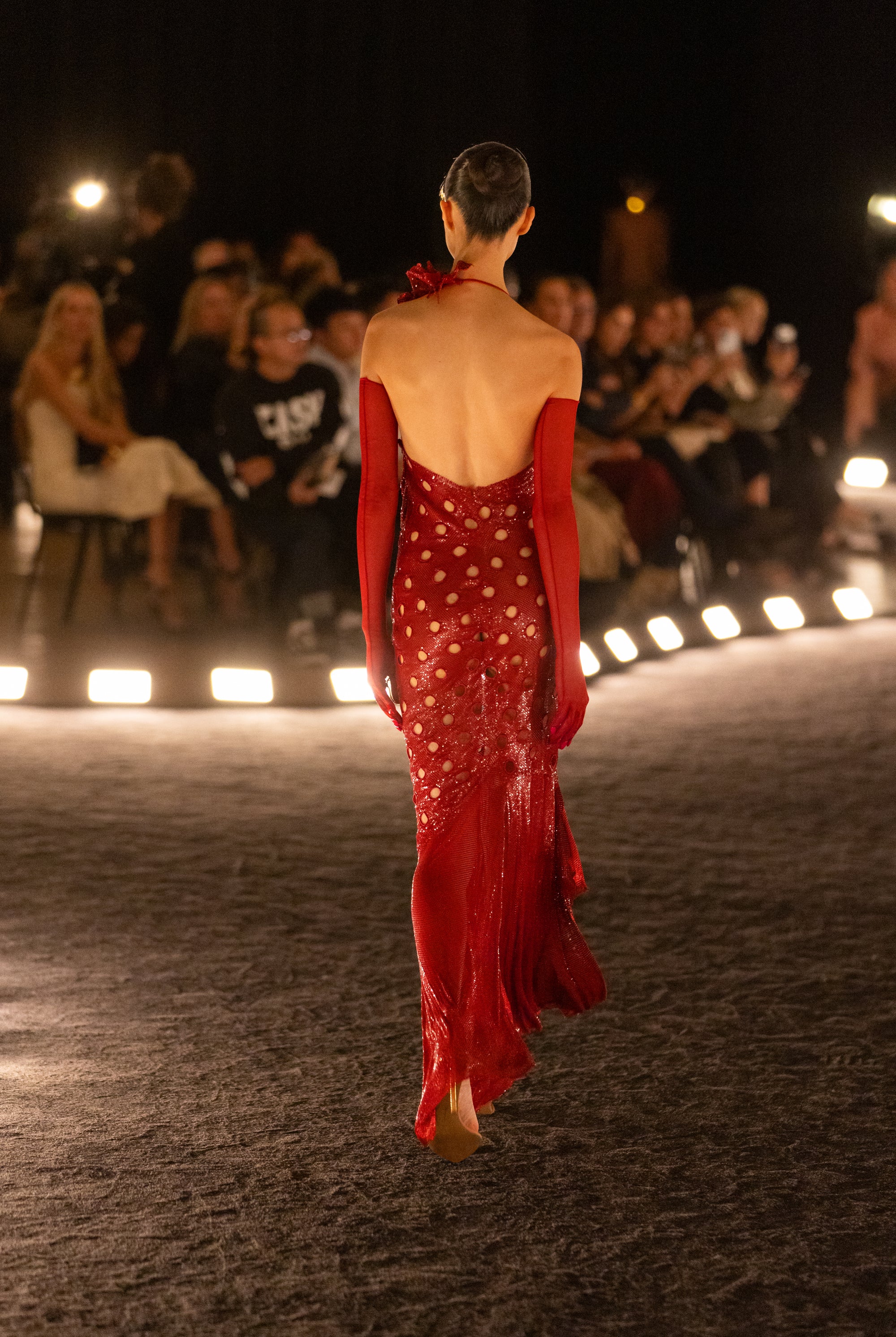 Robe asymétrique en maille métallisée rouge découpée en forme de pois et rehaussée d’une fleur brodée à l’épaule. Longs gants assortis. Sandales à bout pointu en suède taupe dotées d’un talon incurvé en métal doré finissant par une main sculptée.