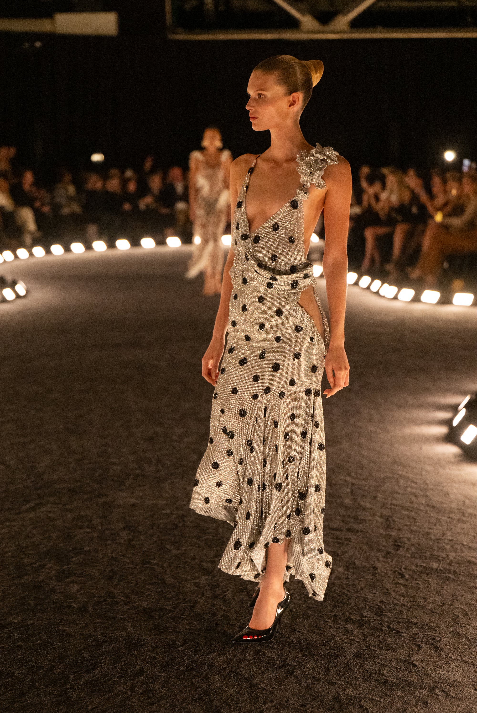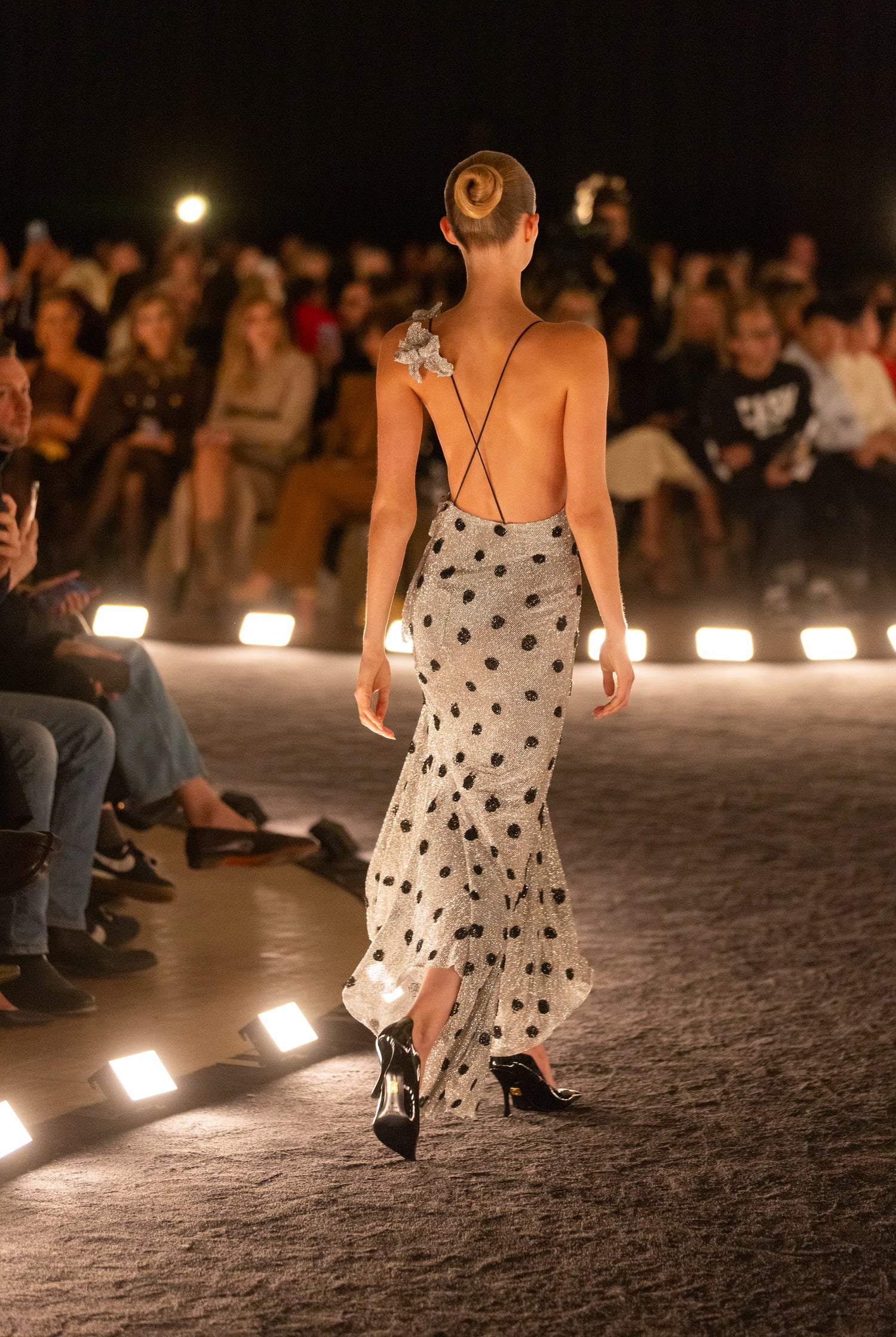 Robe à fines bretelles en maille cristal argent brodée d’un motif de pois noirs contrastés. La robe est rehaussée d’un décolleté vertigineux et de fleurs brodées à l’épaule. Escarpins en cuir vernis noir décorés de dessins à l’effigie des codes de la Maison peints à la main.