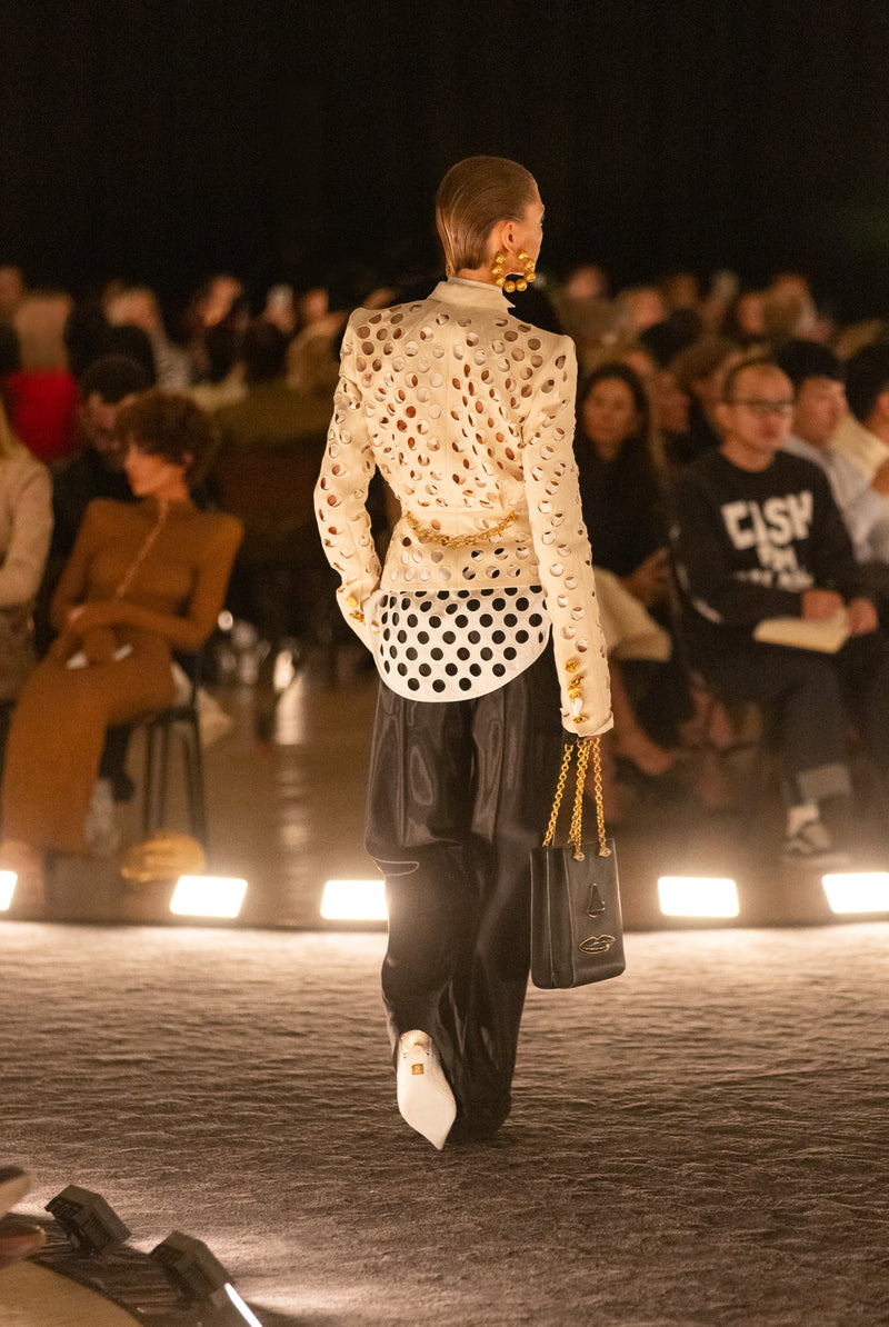 Veste cintrée à simple boutonnage en toile chinée écrue entièrement ajourée selon un motif de pois. Elle est portée sur une chemise de smoking en popeline de coton blanc avec les mêmes découpes, créant un effet de superposition surréaliste. Pantalon à jambe large en satin fluide noir coupé en biais rehaussé d’un large revers sur le bas et d’une nervure sur toute la longueur de la jambe. Créoles dépareillées composée pour l’une de sphères en laiton doré martelé, et pour l’autre de nacre et de métal doré. Sac Soft Face en cuir noir rehaussé de bijoux anatomiques en métal doré et pâte de pierre ton sur ton formant un visage en trompe l’œil. Bottines derby en cuir blanc tressé à la main au laçage corset et rehaussées d’œillets bijoux dépareillés en métal doré et strass et d’un petit talon évoquant un soleil.