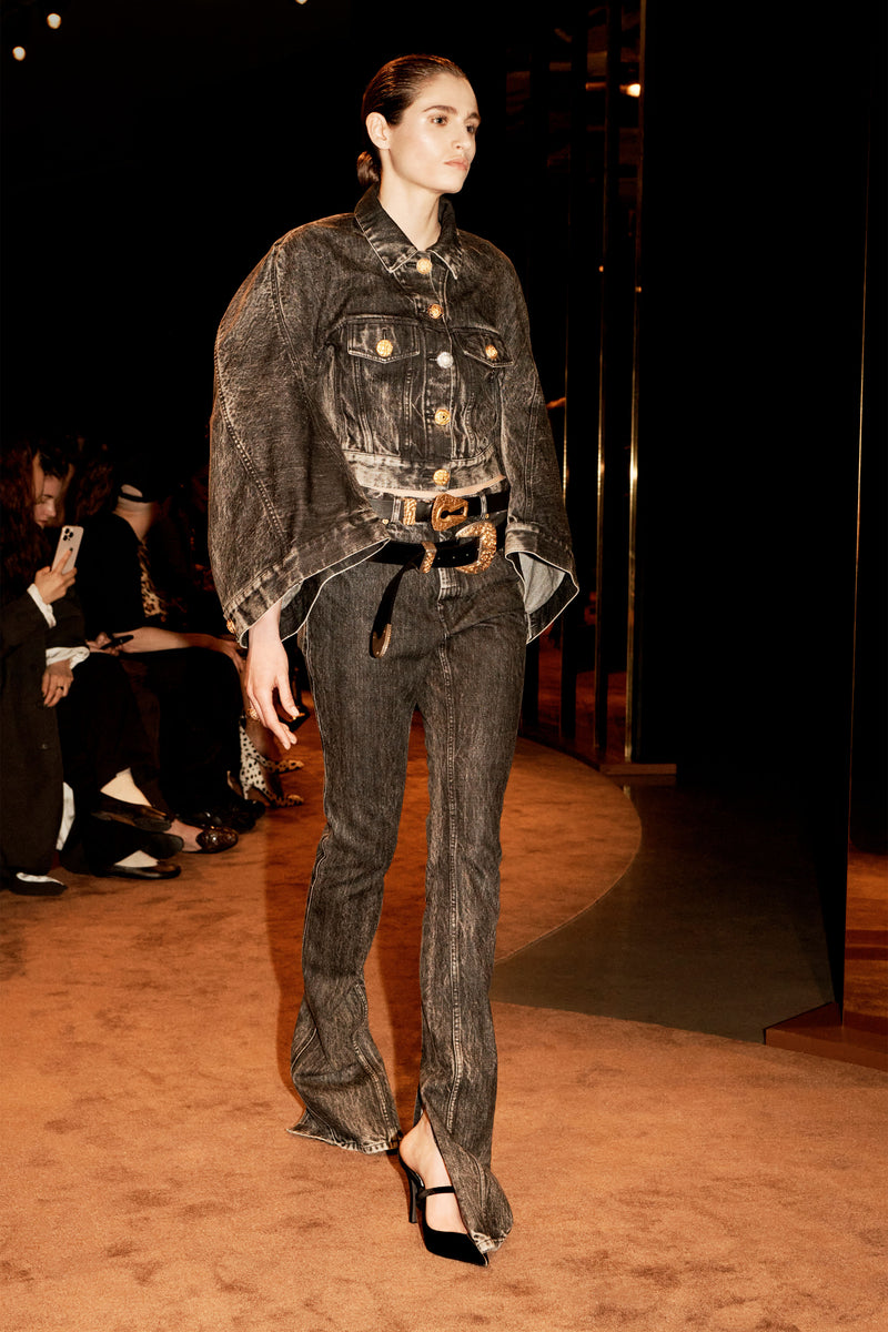 Much of the playfulness of this collection comes from its juxtapositions, trompe l’oeil mischief, and unexpected dimensions. A blown-up feather motif was flocked onto double satin and stamped into spongy neoprene velvet. Our new slouch-side top handle day bag is blown up to epic proportions: a place where a woman can store her entire life on the go. Our soft Soufflé bag comes covered with hundreds of gleaming golden studs. What looks like a column skirt made from heavy jacquard is actually a light-as-air cut thread in pure ivory. A stretch flocked bodysuit looks constricting but moves like a leotard. Our signature gold jewelry has also become lighter, with our favorite motifs (eyes, noses, keyholes) finding new life in textured-gold metal chandelier earrings and necklaces. The silhouettes pay homage to my childhood in Texas, where I was even then studying local iconography: There are versions of such classic ranch pieces as the duster coat, the bow-legged jean, the Red Wing cowboy boot, and the oversized cowboy belt buckle (here decorated with iconic codes of the Maison: the keyhole and the lobster). These were clothes that were made to be practical, and over the years, became their own recognizable style.