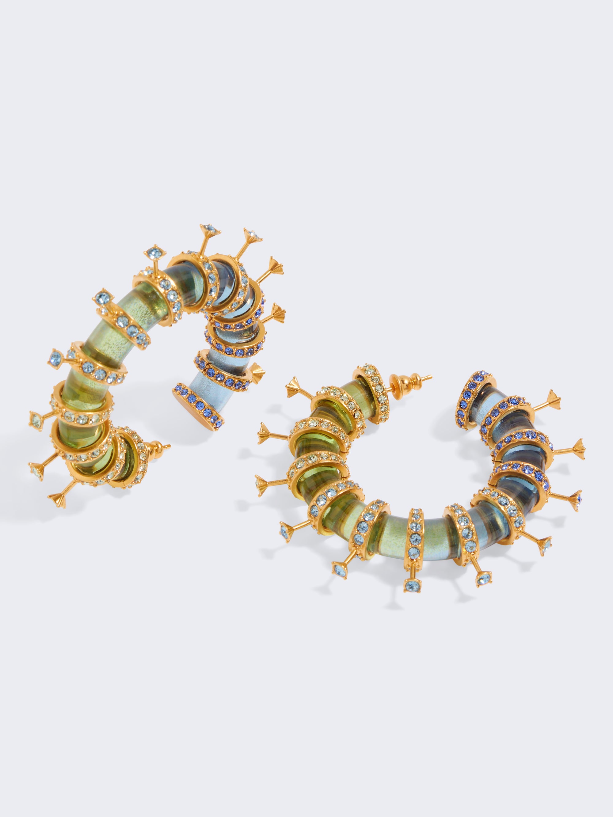 These abstract hoop earrings in gradient blue and green resin are topped with rhinestone spikes.