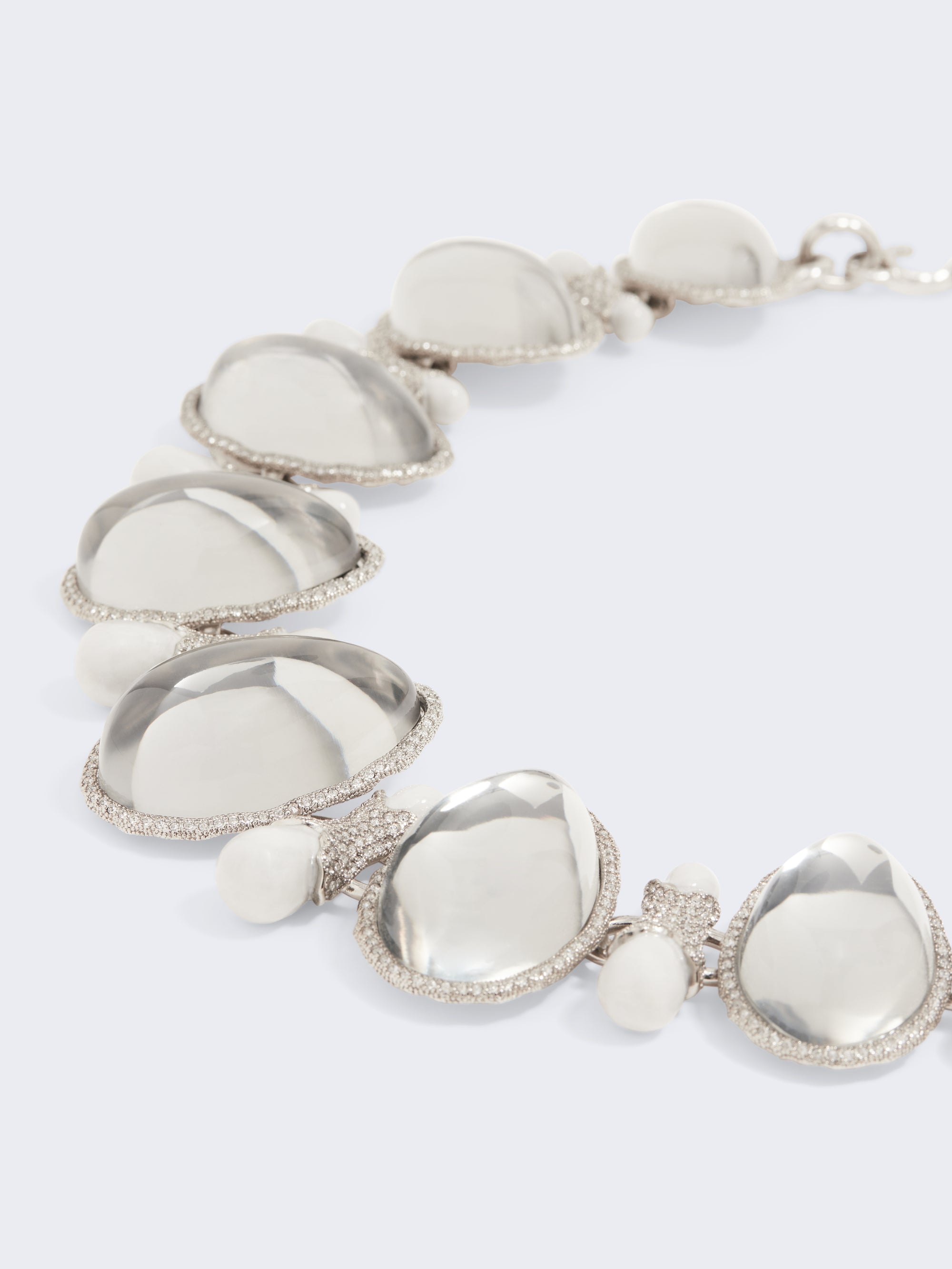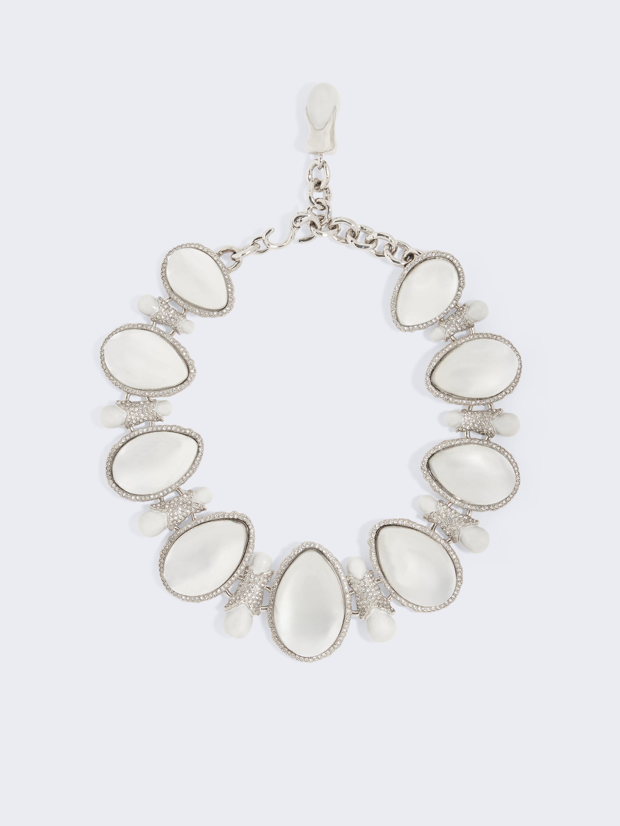 This abstract choker necklace features a series of crystal-colored resin cabochons adorned with rhinestones.
