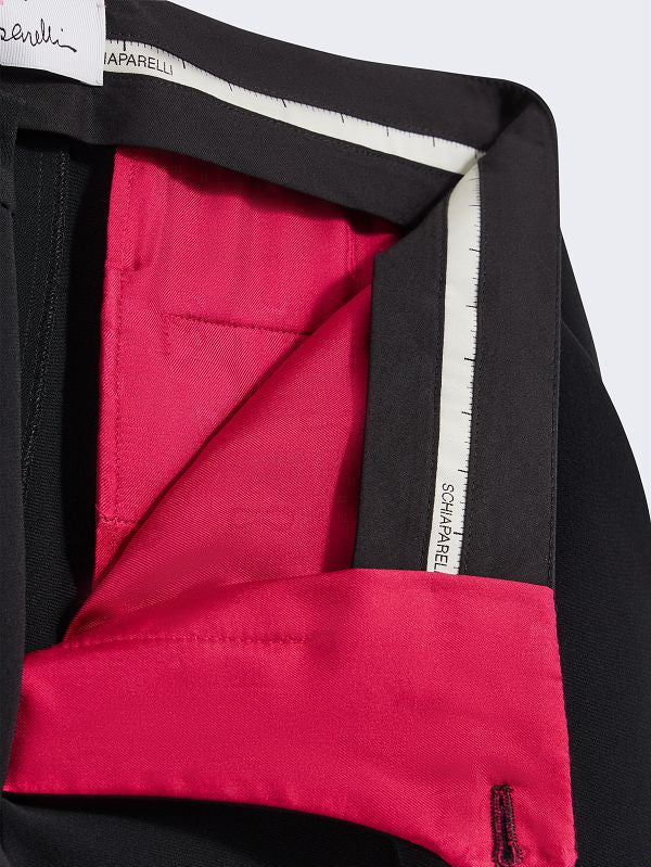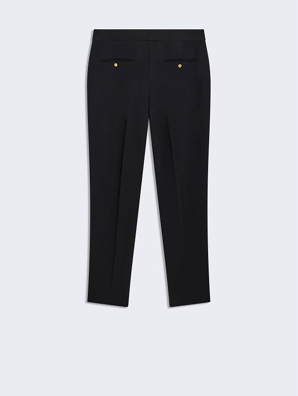 Infinite trousers in black cady, welt pockets closed by a button. Hammered gold brass lock.