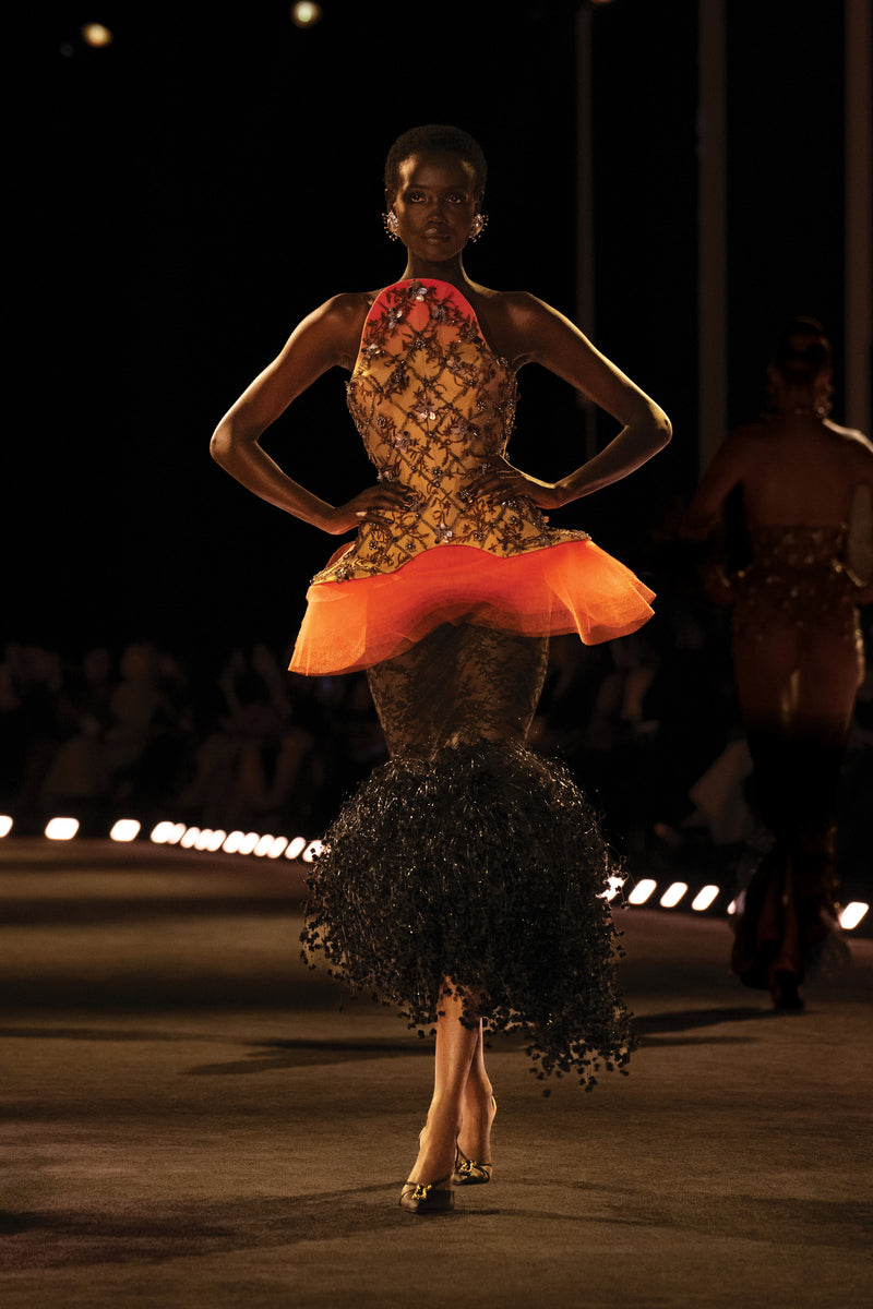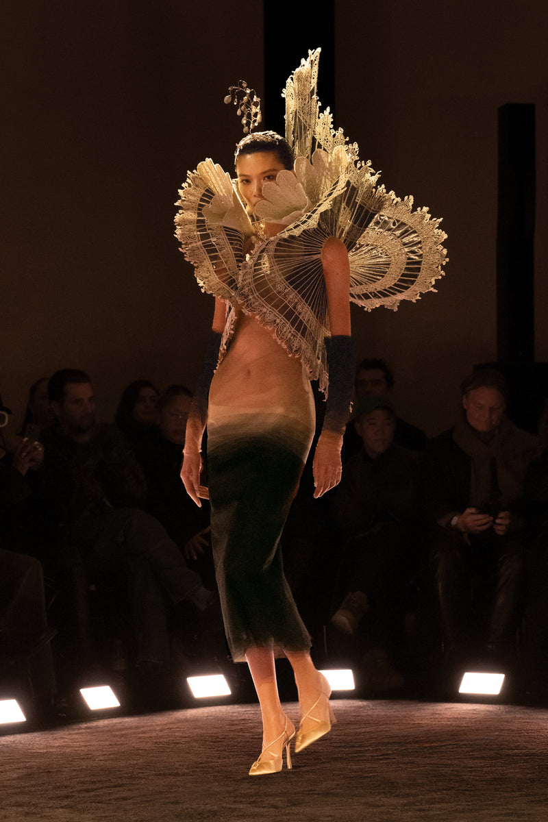 La couture n’existe pas sans structure, sans la rigueur et les règles de ses propres traditions. Mais dans ce cadre, c’est au créateur de trouver la liberté, de repousser les règles du médium jusqu’à leurs limites absolues. Pourtant, cette collection n’est pas seulement une avancée ou un lâcher-prise ; c’est une célébration de la profondeur du savoir-faire et du talent de nos ateliers, qui travaillent tous au sommet de leurs capacités techniques et imaginatives. La dentelle coupée à la main est travaillée en bas-relief pour lui donner un aspect 3D, créant ainsi de la profondeur et des ombres. Les plumes, qu’elles soient véritables ou en soie trompe-l’oeil, sont peintes à la main, aérographiées ou trempées dans de la résine et des cristaux. Des couches de tulle fluo sont superposées sous la dentelle pour leur donner un effet sfumato. Chaque look a un « crochet » ou un nom, comme « Isabella Blowfish », un incroyable ailleur-jupe en couches de tulle et d’organza, saupoudré d’ombres de cristaux aux couleurs du poisson-globe et fini avec des pointes d’organza. La collection s’inspire des couleurs des oiseaux de paradis - roses, bleus, safran - qui trouvent leur expression ultime dans l’une de nos vestes les plus fantastiques à ce jour.