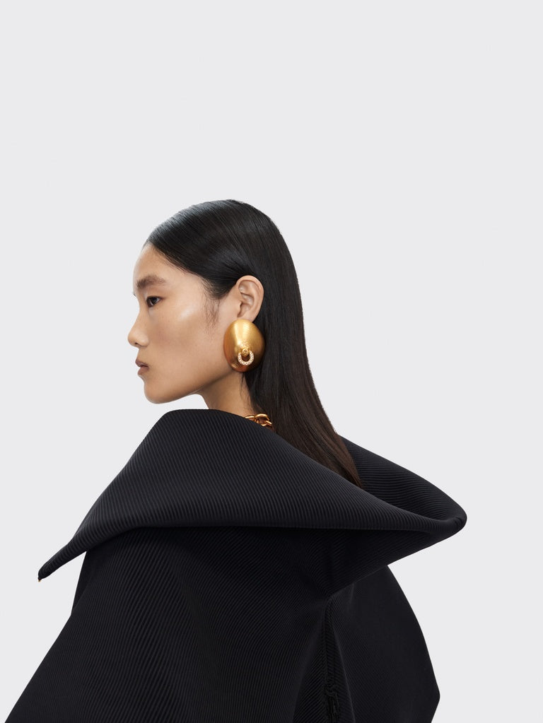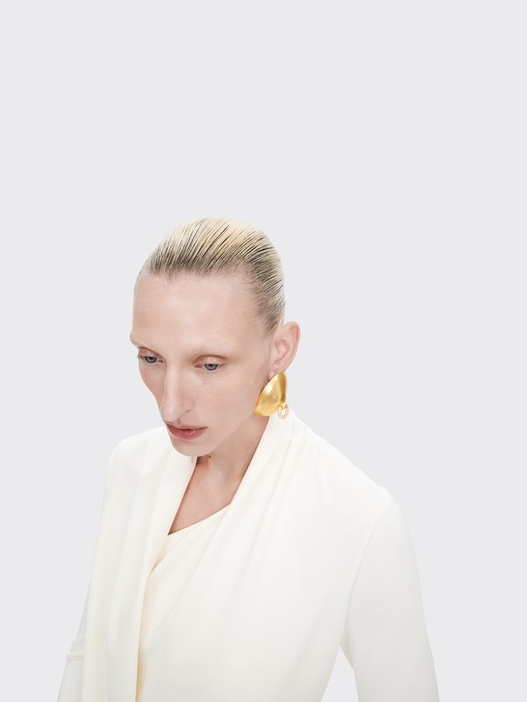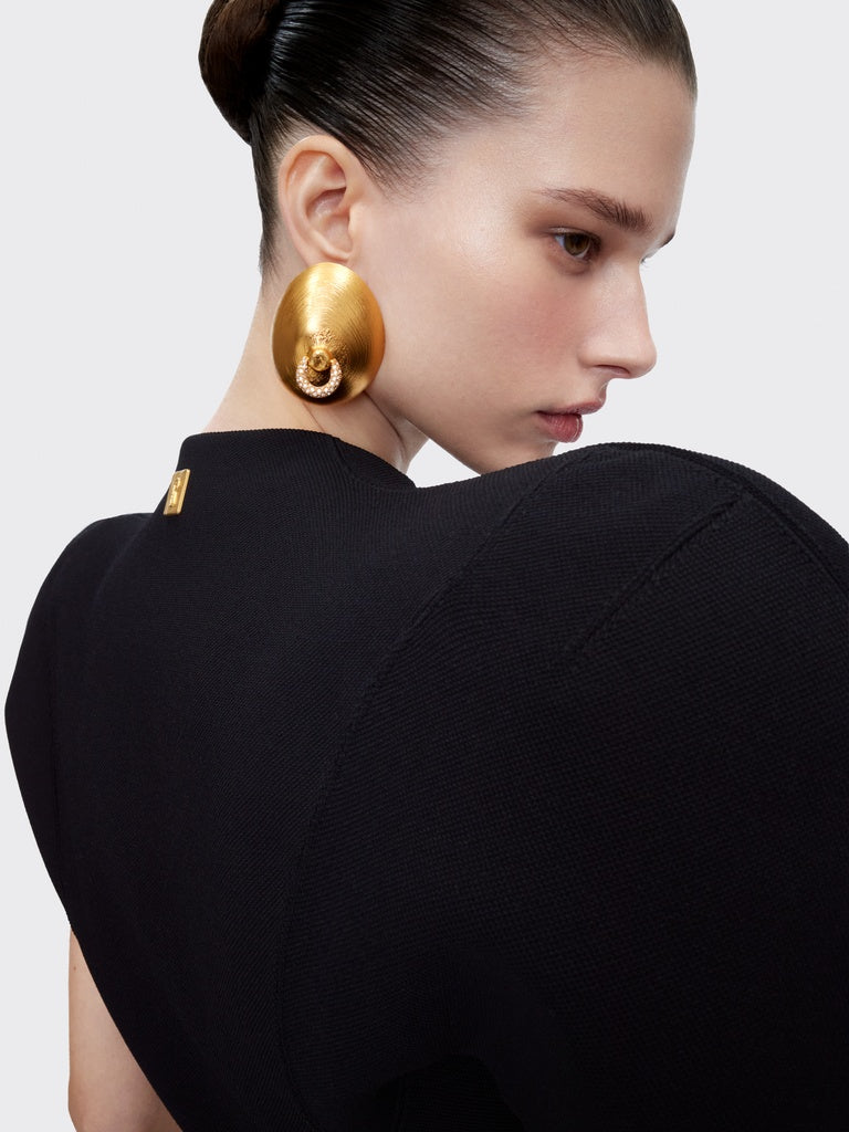 Ces boucles d'oreilles Tétons signature en laiton doré ornées d'un piercing à strass possèdent la forme d'un coquillage, consacrant une rencontre surréaliste entre deux objets comme aime à le faire la Maison.