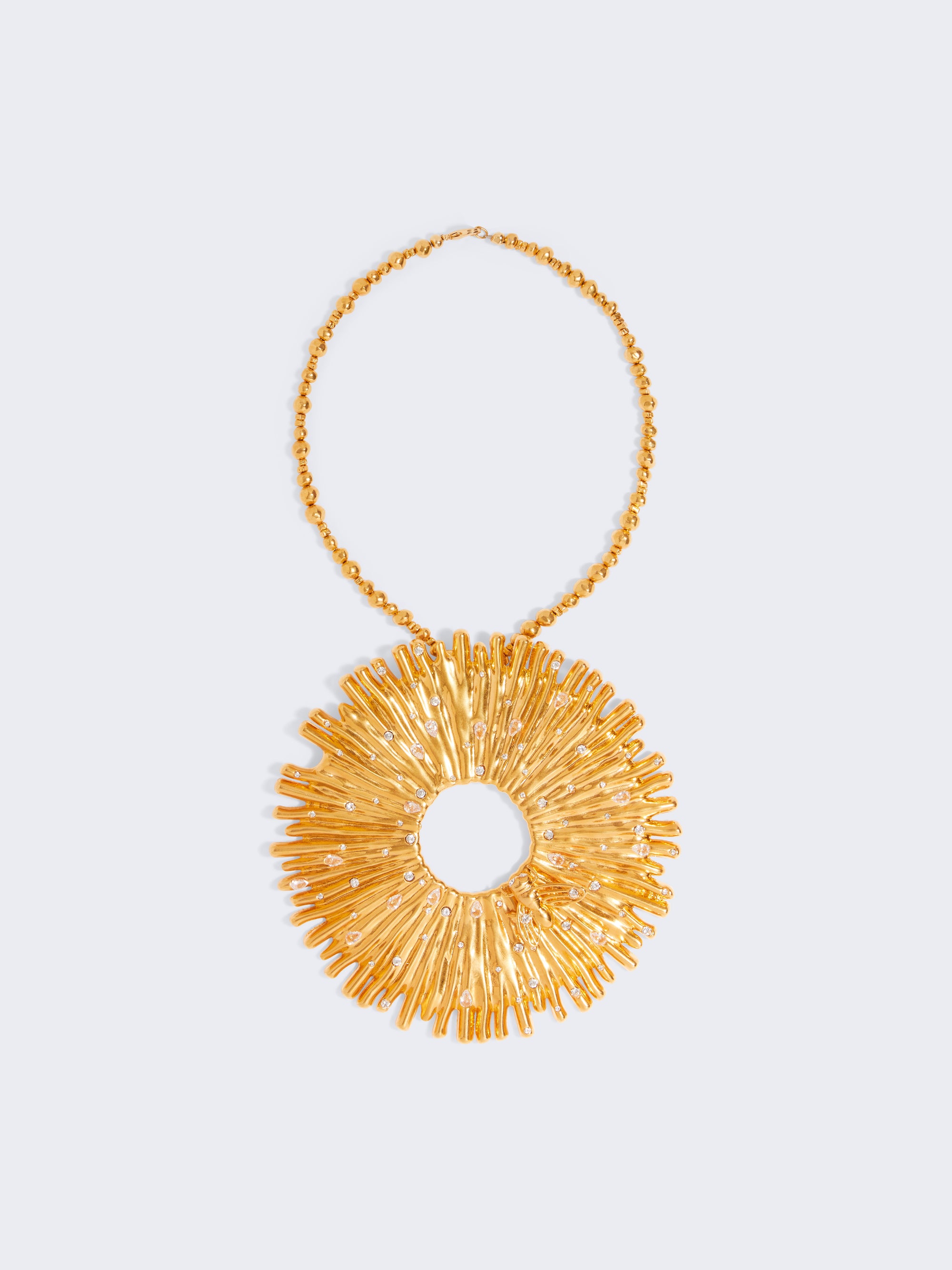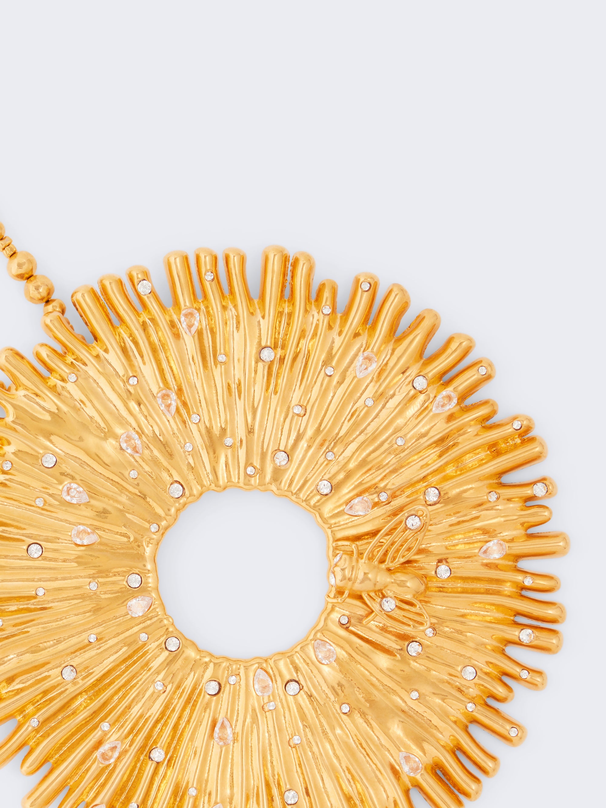 Ce collier ras-du-cou en laiton doré texturé est surmonté d’un large pendentif représentant une fleur avec une abeille dessus.