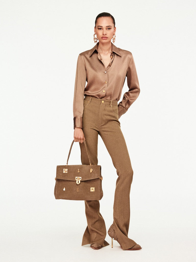 Cette chemise à manches longues à la coupe classique en satin épais marron est rehaussée de boutons bijoux dorés sur le milieu devant et en bas de manches.