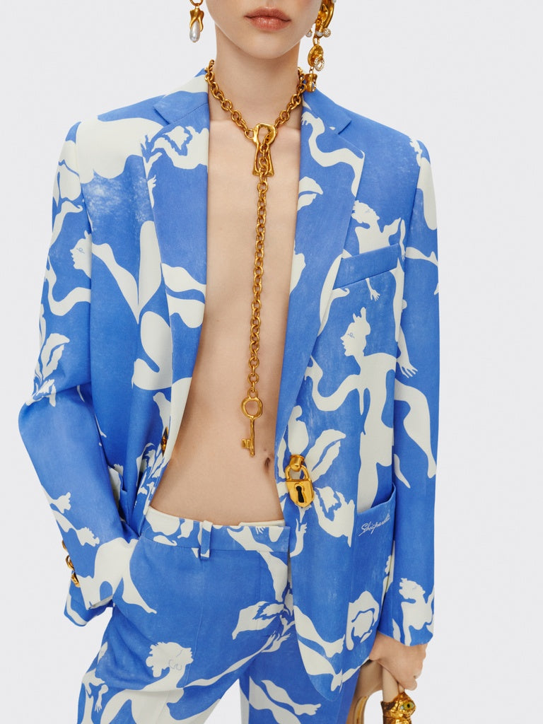 Notre pantalon boyfit à la jambe légèrement évasée est réalisé en viscose bleue imprimée de dessins originaux de Daniel Roseberry en blanc contrasté. Il est réhaussé de poches passepoilées à l'arrière.