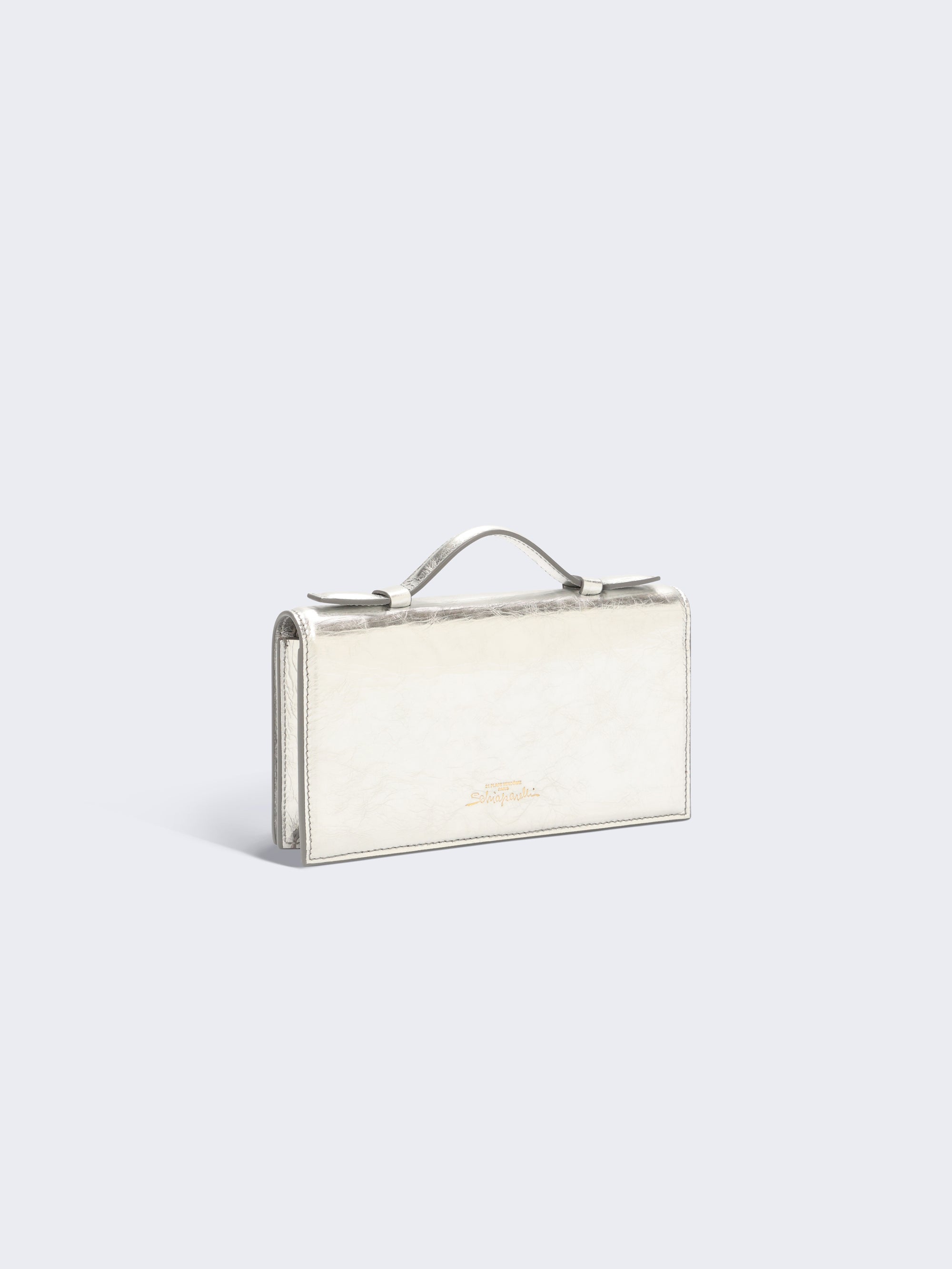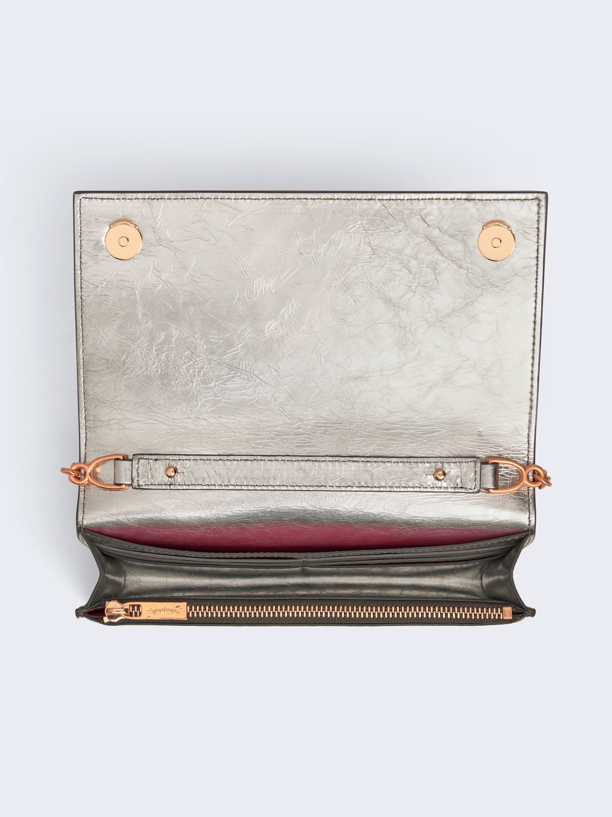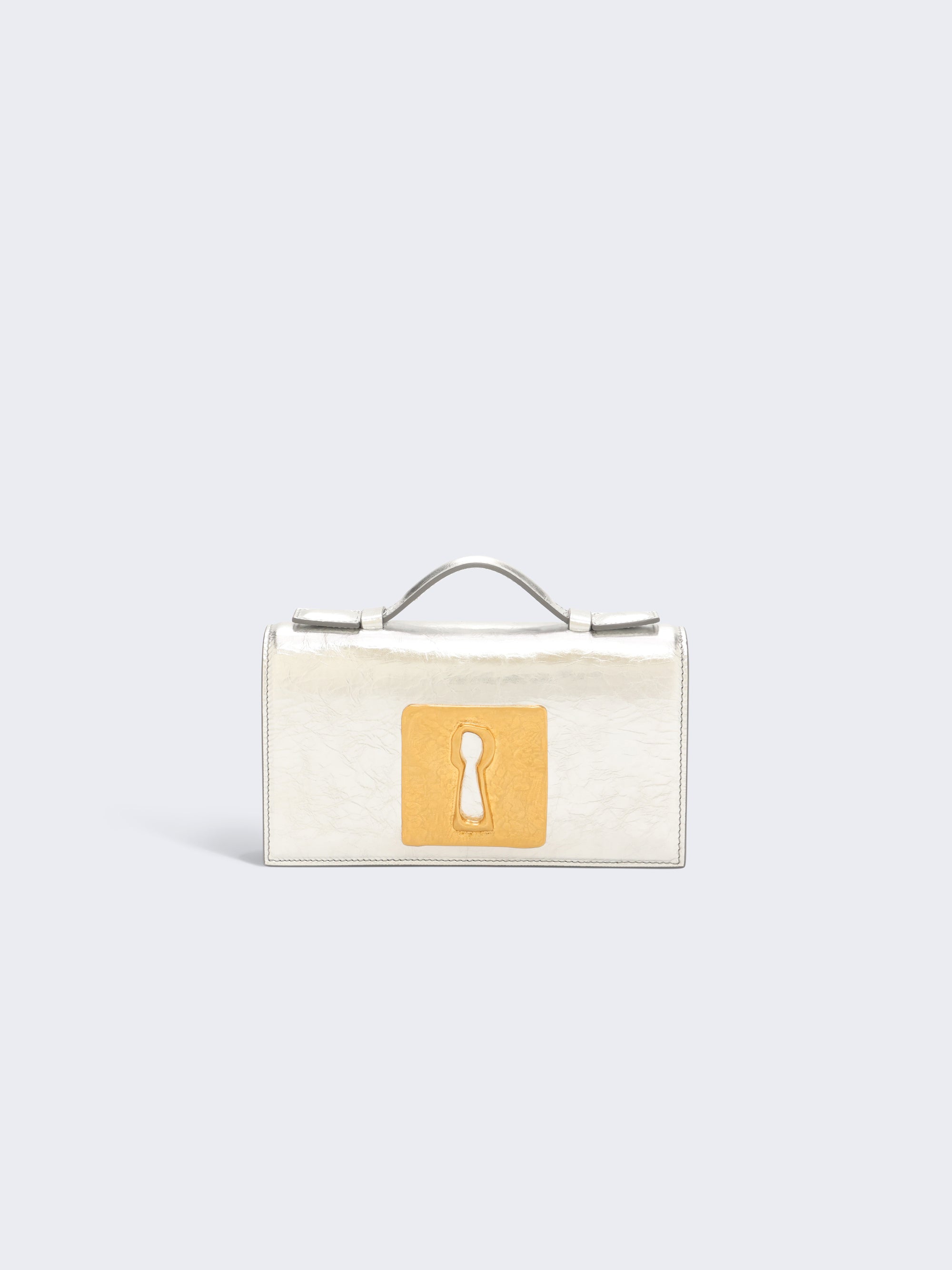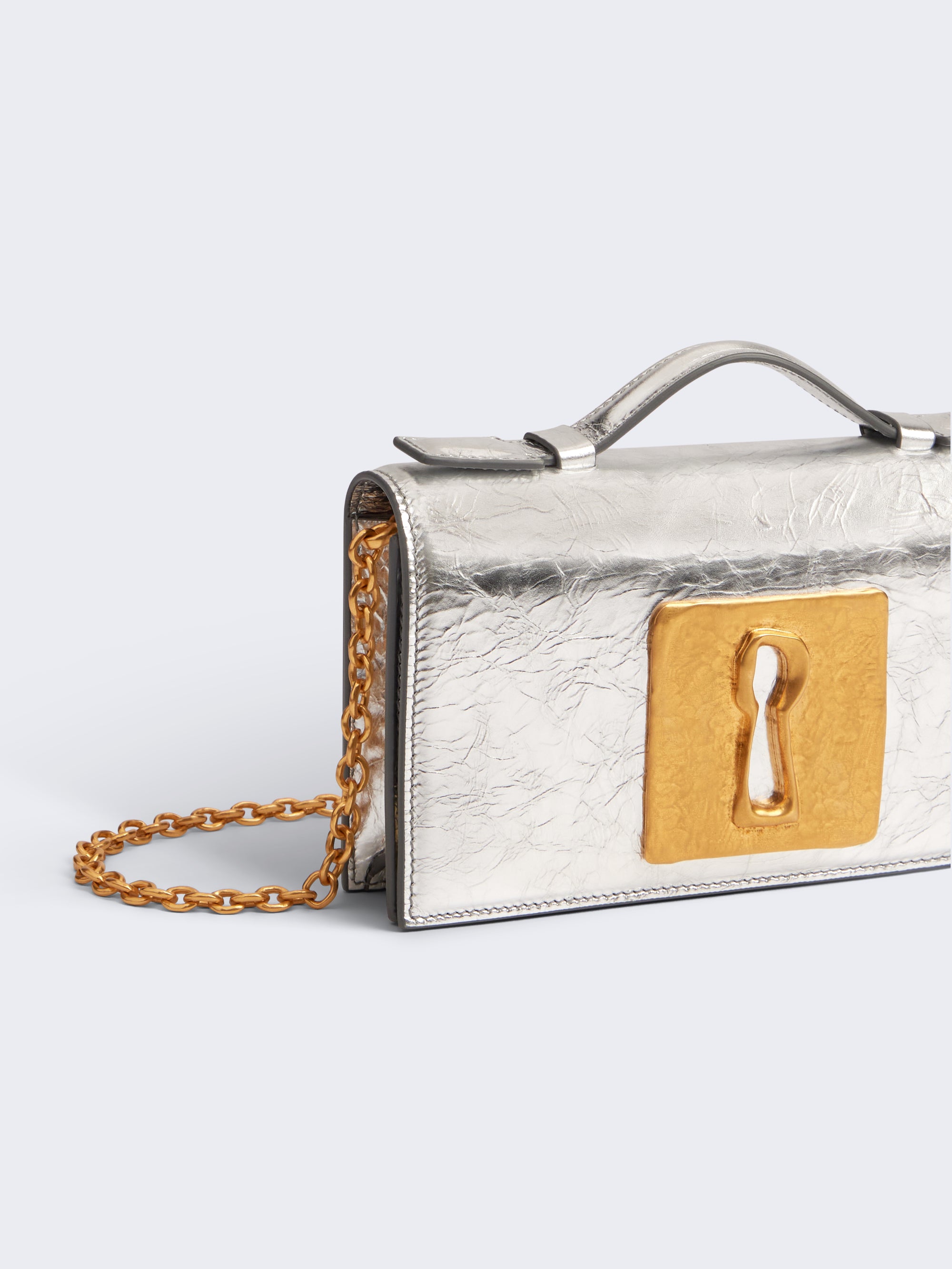 Cette pochette en cuir de veau froissé laminé argenté réhaussée d'une plaque Trou de Serrure signature en laiton et d'une chaîne à maillons en métal doré rend hommage à l'un des codes phares de la Maison.