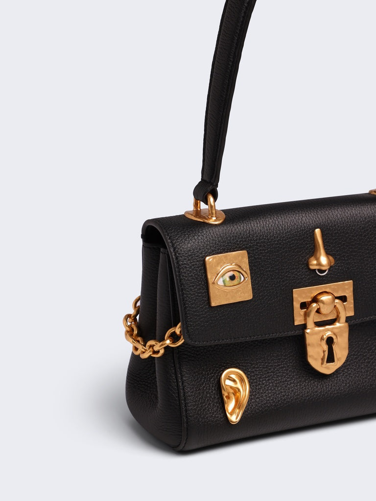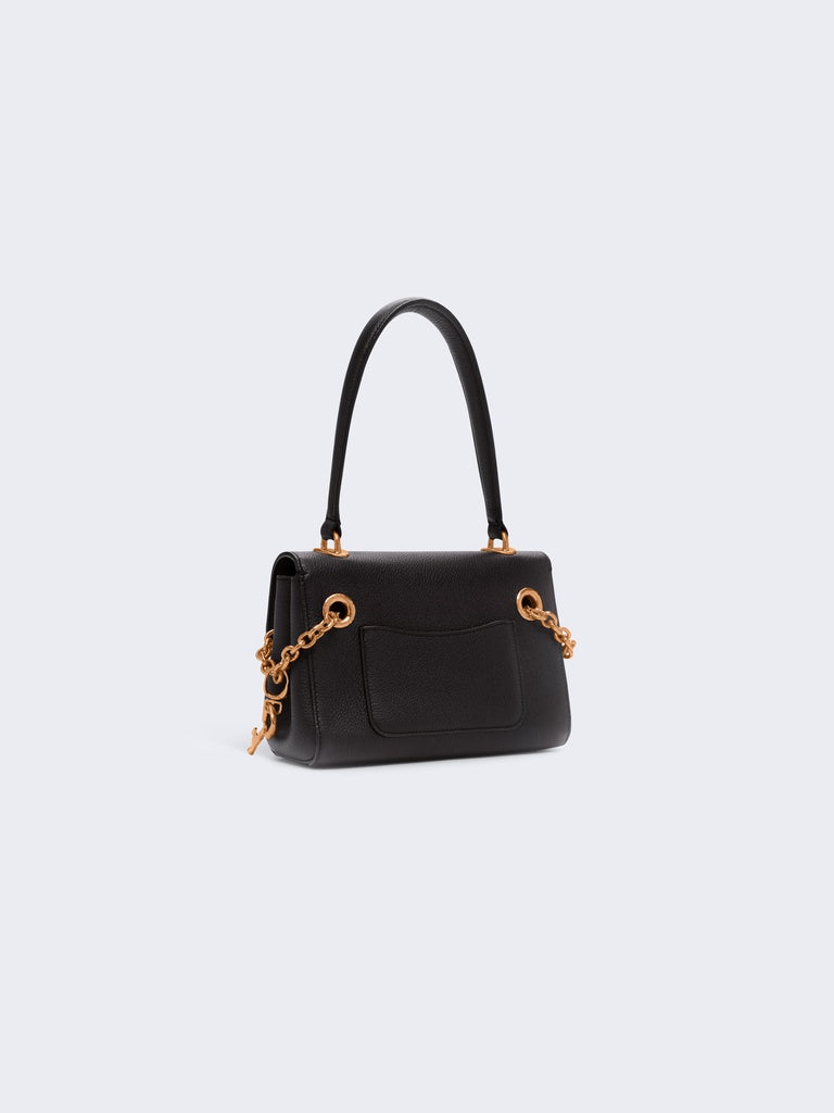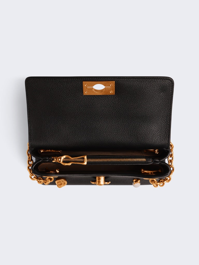 Ce mini sac Secret bijoux souple est confectionné en cuir de veau grainé noir.