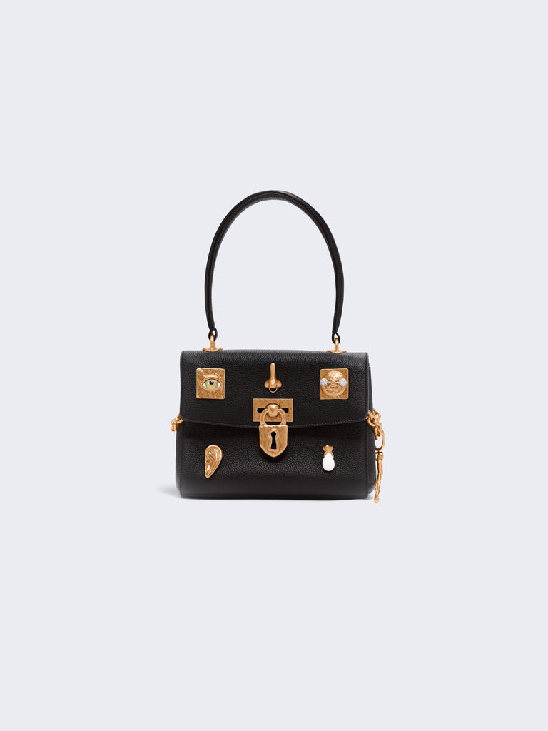 Il est rehaussé de boutons bijoux à l'effigie des codes emblématiques de la Maison, d'un fermoir Cadenas, de chaînes décoratived et d'une Clé bijou signature en métal doré.