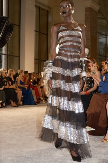 Silver patent leather Perfecto jacket covered in tulle and enhanced with matador-style saddle shoulder pads. It is worn over a white cotton poplin shirt, highlighted by a black duchess satin tie and matching torero pants. Silver brass hat-shaped earrings with rhinestones. Long white satin gloves covered with black mesh. Black satin slingbacks enhanced with a mall silver metal hand-shaped heel.
