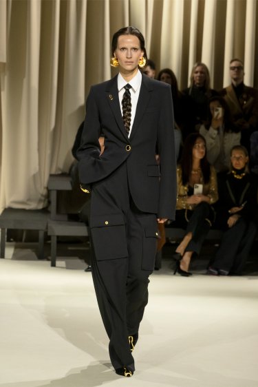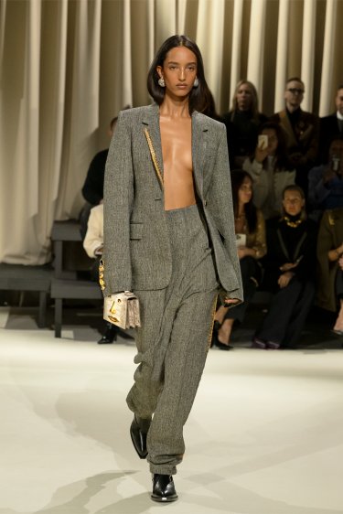 Single-breasted suit jacket in mottled linen and wool blended fabric embellished with bijoux buttons on the bottom sleeves and signature Measuring Tape embroidery on the collar lapel. Matching high-waisted pants with low crotch and narrow leg decorated with gold signature Measuring Tape embroidery on the sides.