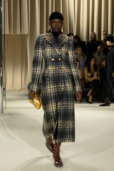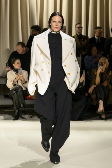 Off-white double-faced wool peacoat embellished with bijoux buttons at center front, bijoux buttons at bottom sleeves and signature Measuring Tape embroidery on collar lapel. Long- sleeved top in ribbed black jersey. Extra-large cowboy pants in black wool twill.