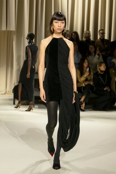 Asymmetrical dress in black velvet and crepe jersey, held together by a gold chain necklace. The left side of the dress is fully draped and enhanced by a train held in place by a gold chain.