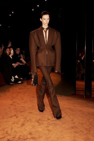 Jacket in brown calfskin leather embossed with the Maison’s emblematic codes enhanced with an oversized contrasting off-white shearling collar. Its cinched waist is highlighted by belt straps adorned with a large signature Keyhole bijou in gold metal. The jacket is worn with matching high-waisted cowboy pants. Gold hammered brass bolt earrings with signature S. Western-style stiletto ankle boots in brushed brown leather, adorned with a rhinestone ring around the heel and a removable Keyhole strap in tonal leather.