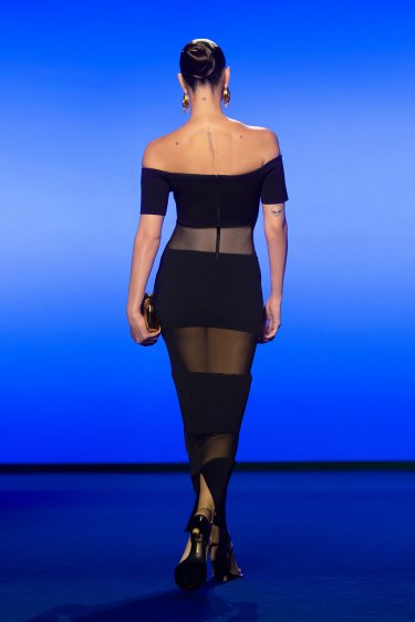 Off-the-shoulder maxi knitted dress in white viscose with contrasting black transparent mesh strips. Matching earrings featuring textured ribbon with hammered silver brass rhinestone piercings. Rigid silver metal minaudière featuring a signature moulded Mouth. Bijoux sandals in black leather with small heels, embellished with a signature Mouth toe strap in gold metal and a rhinestone ring at the heel.