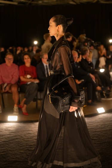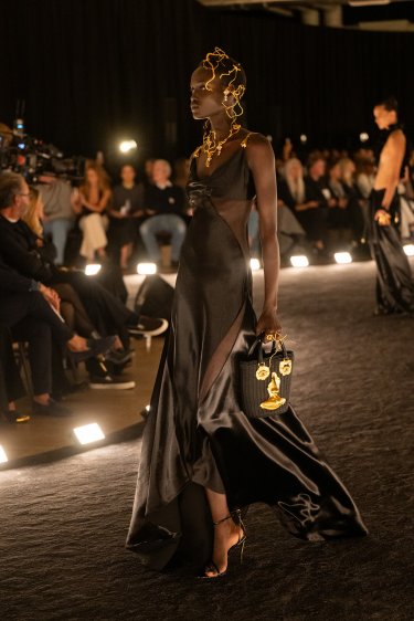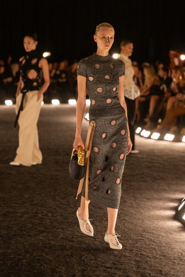 The accessories are equally designed to remember, surprise, delight, from shoes to new incarnations of the Secret, our padlocked handbag, here made in soft dimensions to recall Dali’s oozing, melting clock. Every shoe and handbag begins with drawings, which I think you can see and feel in the final products.