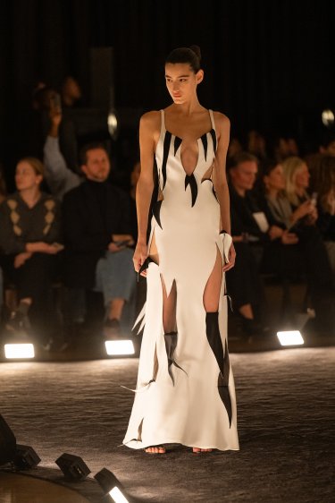 In this collection, you’ll see her love of tension, of unexpected frictions. You see it in the Schiaparelli jacket: Sober, clean, and sharp shouldered, without any grandiose flourishes, it’s a celebration of discipline itself, with its controlled silhouette (or “tailleur riguor,” as they say in the atelier). That “hard chic” continues in a series of long, lean, slip-on column gowns. Though they represent a kaleidoscope of techniques, they’re united by their focused palette of black, bone white, and crimson red. And at the heart of this collection is the trompe l’oeil knitwear, taken from my drawings over the last few months and executed in three-tone jacquards—a tribute to Elsa’s own knits. Shocking then, shocking now.