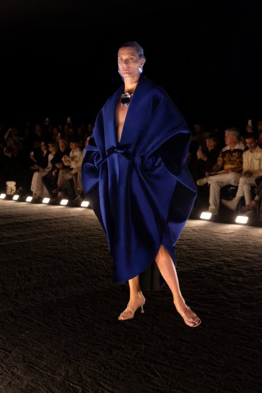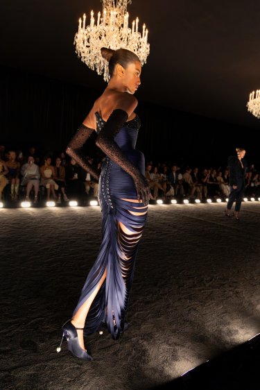 Bustier gown in navy blue duchesse satin with exaggerated hipline composed of several layers of hand-cut ribbons revealing the skin as it falls down the body.