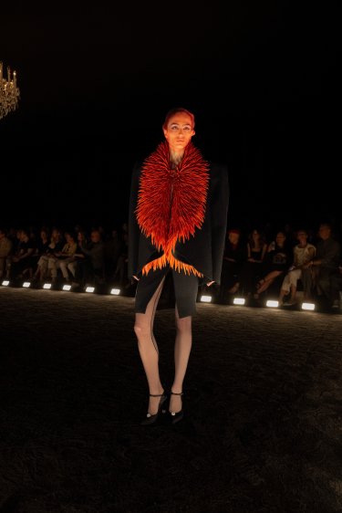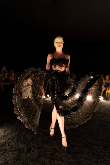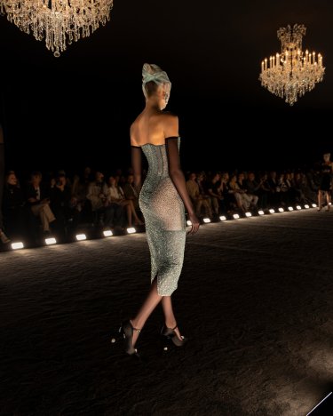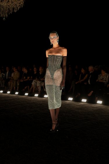 Illusion corset dress in sheer pale green mesh entirely embroidered with dusting- effect rhinestones and sequins.