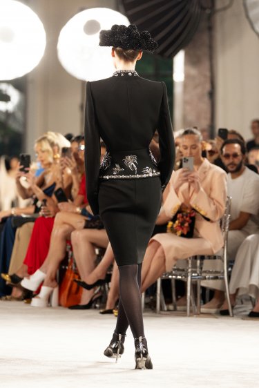 Black dry wool tailored jacket embroidered with a palm tree motif from the Maison’s archives in silver badla, rhinestones and sequins. Matching pencil skirt in black dry wool. Black felt hat fully embroidered with tonal pearls. Black satin slingbacks enhanced with small silver metal hand-shaped heel.