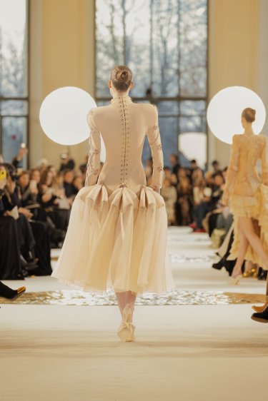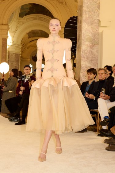 Asymmetrical dress with blush compact jersey high neck jacket trimmed with scalloped edges embroidered with Schiaparelli archive-inspired pale gold chords and pink enamel flower bouquets at the center and on the sleeves. It is enhanced with tonal cone pleats and tulle at the bottom. Heeled mule with an asymmetrical wavy décolleté in nude floral corset canvas.