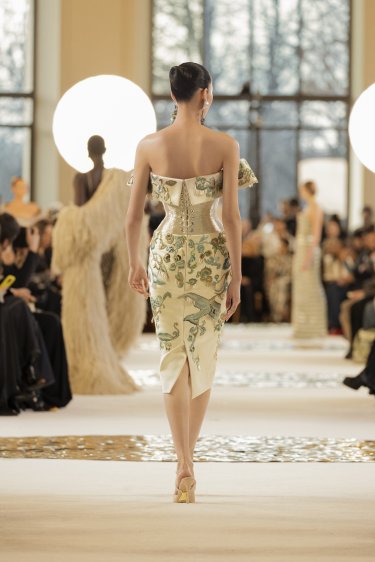 Off-the-shoulder dress in satin duchess embroidered with flowers and emblematic codes of the Maison in traditional satin stitch and pale gold beagle fringes, enhanced with a corset fully covered in pale gold beagle beads and laced at the back. Mismatched earrings made of vintage assembled elements. Heeled mule with an asymmetrical wavy décolleté in nude floral corset canvas.