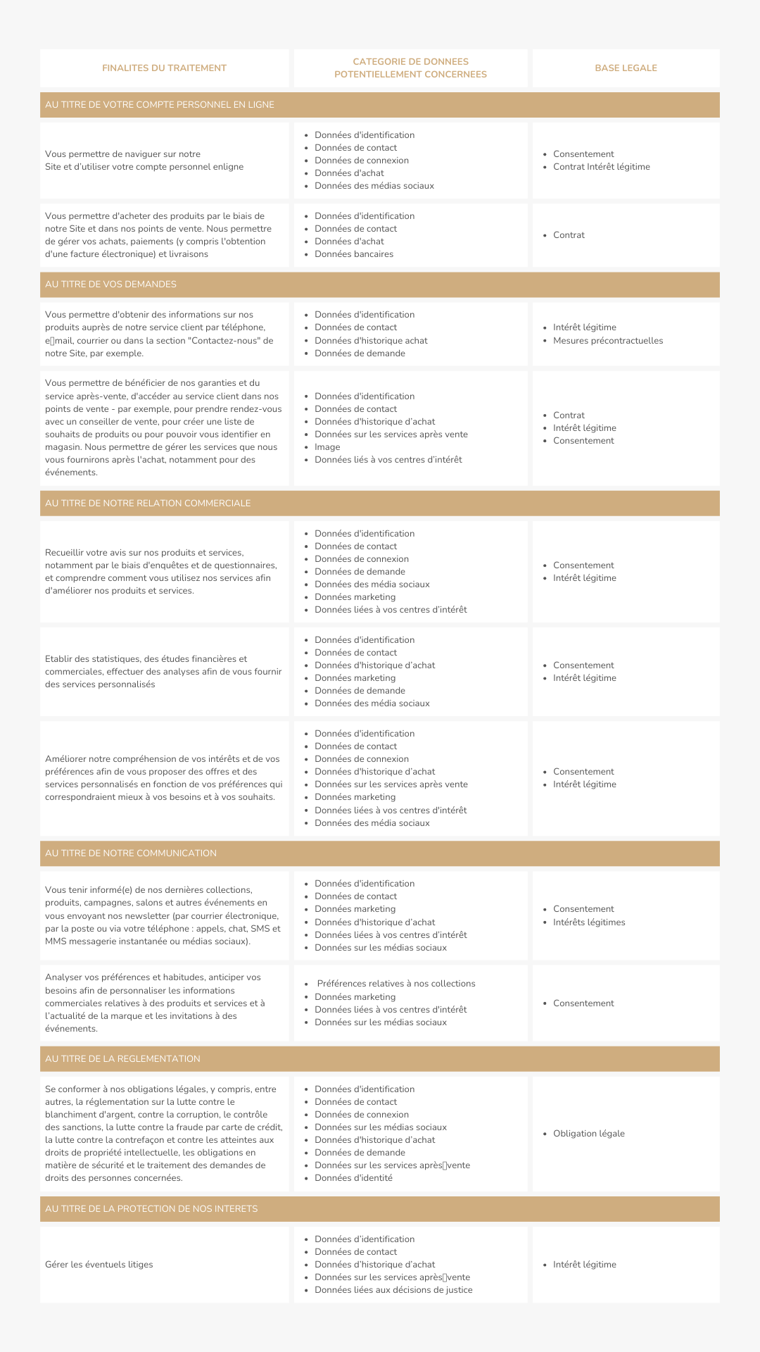 Conformément à l’article 6 du RGPD, vos données personnelles sont collectées, selon les cas, sur la base de notre relation contractuelle, d’une obligation légale, de notre intérêt légitime ou de votre consentement explicite, ainsi que précisé dans le tableau ci-après.