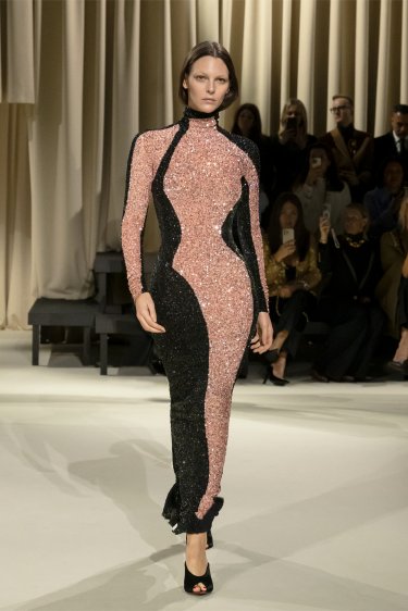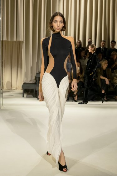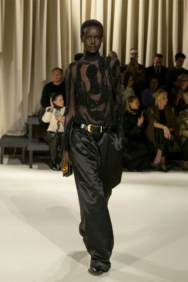 Body en mesh noir entièrement brodé de franges et de sequins ton sur ton et du motif Trou de Serrure signature au centre. Pantalon taille haute en sergé de laine noir à la fourche basse et à la jambe étroite.