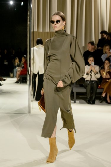 Twin set en mohair brossé noir réhaussé de boutons bijoux dépareillés à l’effigie des codes de la Maison. Jupe midi crayon en sergé de laine toile noir fendue sur le devant avec boutons bijoux dépareillés sur le côté à l’effigie des codes de la Maison.