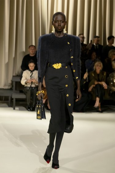 Robe à col montant et manches longues demi-lune bi-matière en velours et jersey noirs. Elle est fendue sur la manche droite et sur le devant, et réhaussée de piercings sur la manche et d’un nœud en gros grain au dos.