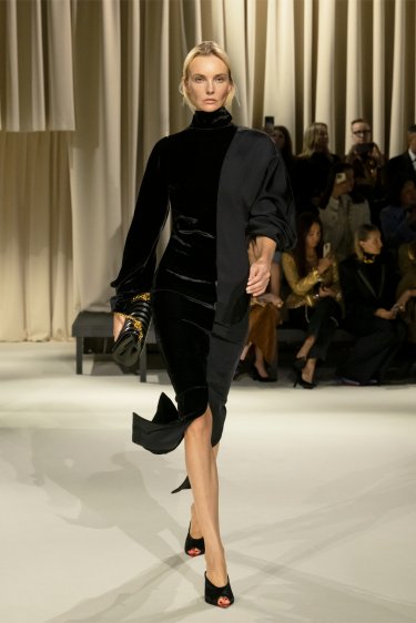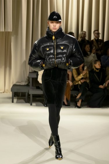 Blouson bombers zippé à col droit en coton satin noir à l’intérieur matelassé réhaussé de boutons pression et d’un tire-zip anatomie signature. Pantalon cigarette en coton satin noir assorti réhaussé de boutons en métal doré et du logo S sur les poches arrière.