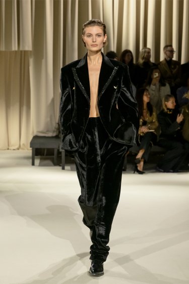 Bustier en velours contrecollé noir décoré de broderies os en tubes noirs ton sur ton. Pantalon taille haute en sergé de laine noir à fourche basse et jambe étroite ceinturé par un bandana à motifs S signature.