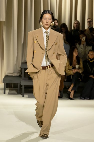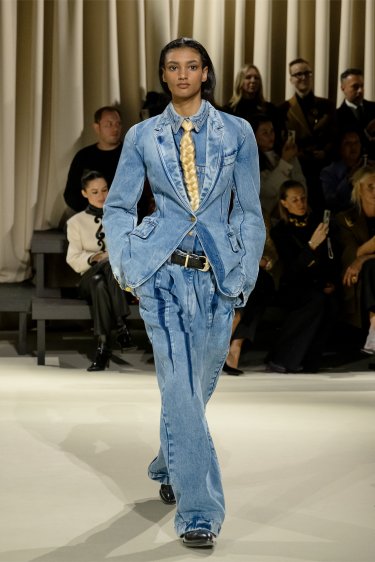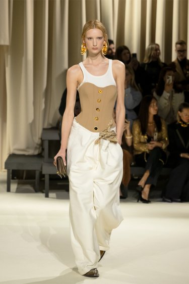 Bustier en sergé de laine sable réhaussé de découpes ton sur ton et de boutons bijoux sur le milieu devant porté sur un débardeur côtelé en jersey blanc cassé. Pantalon extra-large en denim de coton blanc ceinturé par un bandana à motifs S signature.