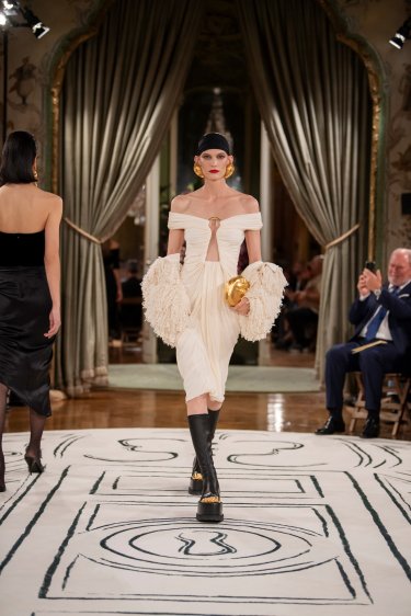 Robe bustier bi-matière au décolleté vertigineux en velours noir et jupe drapée en satin noir ton sur ton. Boucles d’oreilles asymétriques avec d’un côté une boucle d’oreille anatomique avec un œil signature en émail, strass et laiton doré martelé, de l’autre une pluie de larmes abstraites en cuivre doré texturé. Collier homard en céramique dorée réalisé à la main. Mules en cuir vernis noir révélant les Orteils par un Trou de Serrure signature.