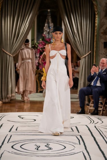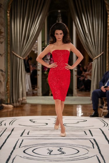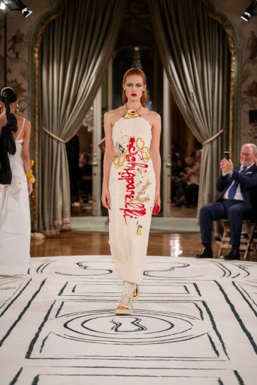 Robe près du corps aux épaules dénudées en coton stretch canevas écru à bord effiloché retenue par un collier ras-du-cou en laiton doré martelé, émail et strass à l’effigie de l’œil signature de la Maison. Sur la robe sont appliquées des broderies fantaisies inspirées du contenu du sac d’une femme en cuir, sequins, perles, émail, strass et résine. Porte- monnaie nez piercé trompe-l’œil en cuir de lézard rouge. Paire de baskets en toile écrue ornée d’Orteils trompe-l’œil dorés signature. Escarpins à bride en cuir noir ornés du détail Orteils trompe-l’œil dorés signature.