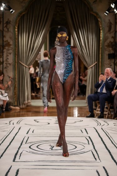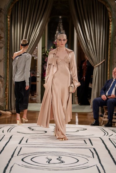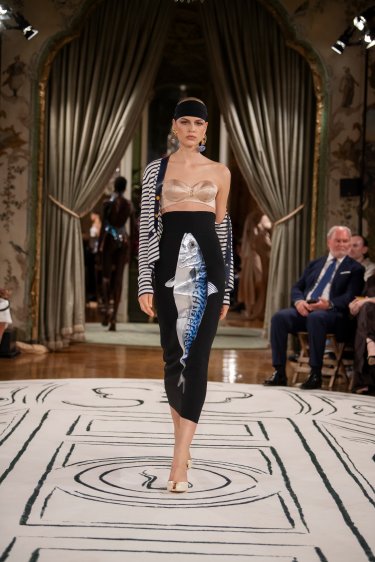 Cardigan en lin rayé écru et bleu marine avec patte de boutonnage en cuir marine frappée du Mètre Ruban signature dorée et réhaussée de boutons pression Serrure signature en métal doré. Il est porté ouvert sur une brassière en satin nude ornée du Trou de Serrure signature en laiton doré martelé, et avec une jupe en cady noir décorée d’un motif de poisson peint à la main sur le devant, et de volants au dos. Boucles d’oreilles asymétriques avec d’un côté une boucle d’oreille anatomique avec un œil signature en émail, strass et laiton doré martelé, de l’autre une larme abstraite en cuivre doré texturé. Mules en cuir vernis écru révélant les Orteils par un Trou de Serrure signature.
