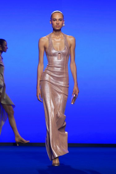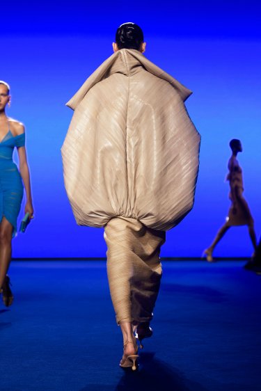 Blouson oversize zippé en cuir d’anguille nude agrémenté de manches chauve-souris, d’un col montant extra-large, d’un tire-zip Trou de Serrure signature. Jupe paréo en tussah de soie sable nouée sur le devant. Sandales bijoux en cuir nude à petits talons réhaussées d’un entre-doigt Bouche signature en métal doré et d’une bague à strass au talon.