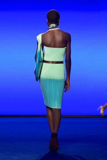 Top bustier en viscose côtelée turquoise rehaussée de bande de cuir ton sur ton appliquées à la main. Jupe crayon assortie en viscose côtelée turquoise avec application de bandes cuir peintes à la main pour créer cet effet dégradé de bleu foncé brillant. Lunettes de soleil en métal argenté martelé ornées du détail Trou de Serrure signature sur les branches. Boucles d’oreilles dépareillées composée d’un cabochon en résine couleur cristal et palladium d’un côté et d’une créole en laiton argenté texturé de l’autre. Grand sac rond en suède turquoise au dégradé bleu brillant rehaussé de breloques Anatomie signature formant un visage sur l’anse. Babouches à pied moulé en cuir marron rehaussées d’un anneau d’orteil à strass.