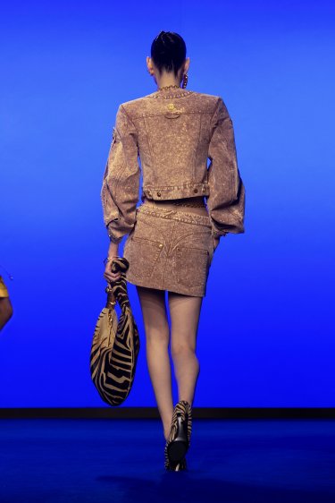 Veste sans col à épaules carrées en coton surteinté et délavé marron rehaussée de détails denim et de poches tiroirs trompe l’oeil avec boutons poignées de porte. Mini jupe assortie En coton réhaussée de détails denim et de boutons bijoux en laiton doré martelé. Sac rond en cuir à motif zebré orné de breloques Anatomiques formant un visage sur l’anse. Escarpins à talons en cuir à motif zébré.