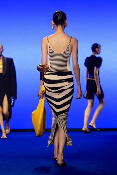 Robe marinière trompe l’œil en viscose rayée écrue et noire et impression paréo en jacquard intarsia rehaussée de fines bretelles bijoux en laiton doré. Bracelet manchette effet bombé en acrylique doré. Grand sac rond en cuir jaune orné de breloques Anatomie signature formant un visage sur l’anse. Babouches à pied moulé en cuir noir rehaussés d’un anneau d’orteil à strass.