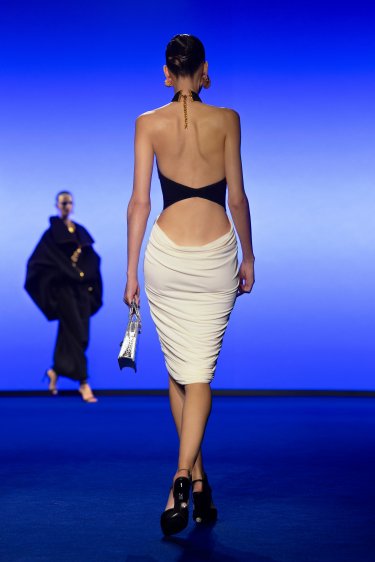 Longue robe dos-nu en jersey compact noir et crêpe jersey écru contrasté drapée sur la partie basse. Boucles d’oreilles dépareillées représentant un cabochon en résine couleur cristal et palladium d’un côté et une boule en laiton doré ornée de strass de l’autre. Sac Bijoux Anatomie en cuir d’alligator laminé argenté décoré de détails anatomiques signature en métal argenté ton sur ton formant un visage en trompe l’œil. Escarpins à talons surréalistes en suède noir au contour subtilement ondulé et rehaussés d’une bride Trou de Serrure signature et d’une bague strassée au talon.
