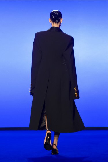 Long manteau en crêpe de laine noir rehaussé d’un col châle en satin ton sur ton et d’os trompe l’œil en surpiqûres blanches contrastées fendu au milieu du dos. Il est porté ouvert sur une jupe courte à taille haute effet corset en cadi noir fendu sur le côté. Collier en laiton doré texturé surmonté d’un pendentif représentant une fleur avec une abeille dessus. Sandales bijoux en cuir noir à petits talons réhaussées d’un entre-doigt Bouche signature en métal doré et d’une bague à strass au talon.