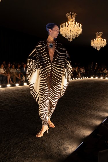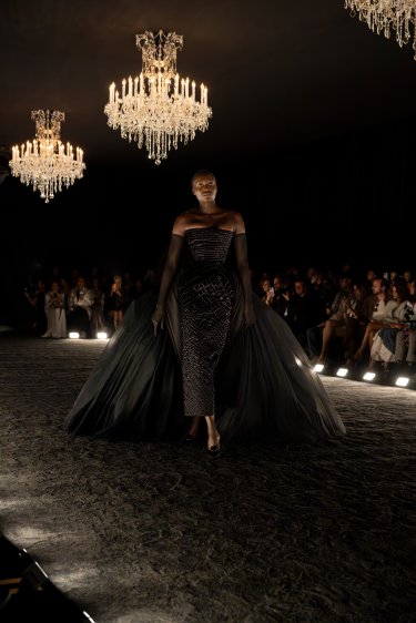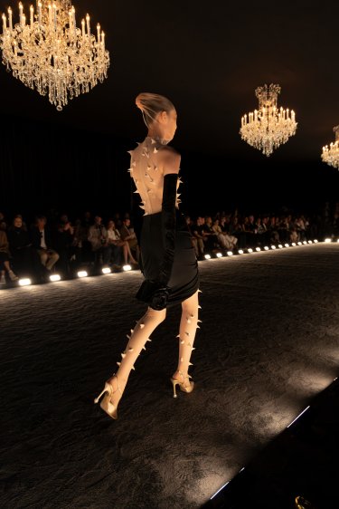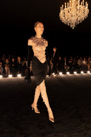 Combinaison nude en maille entièrement brodée d’épines en cuir 3D ton sur ton. Elle est portée sous une jupe paréo en jersey noir.
