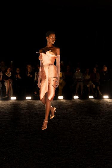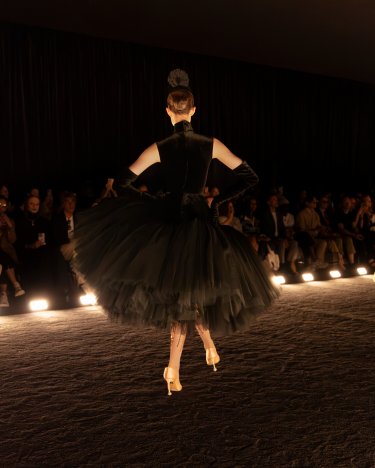 Robe sans manche en velours noir au volume papillon architecturé bordé de tulle dont la doublure est brodée de strass rose clair en forme de carrés. La broderie s’inspire du dessin de la cape iconique Schiaparelli « Apollon de Versailles » issue de la collection Zodiaque de 1938.