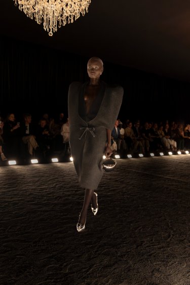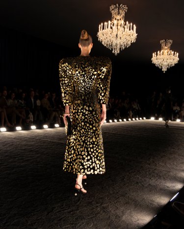 Robe longue en velours noir aux épaules en forme d’ailes de Phoenix et au décolleté vertigineux. La robe est entièrement brodée de pièces en laiton doré martelé.