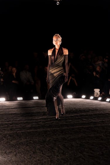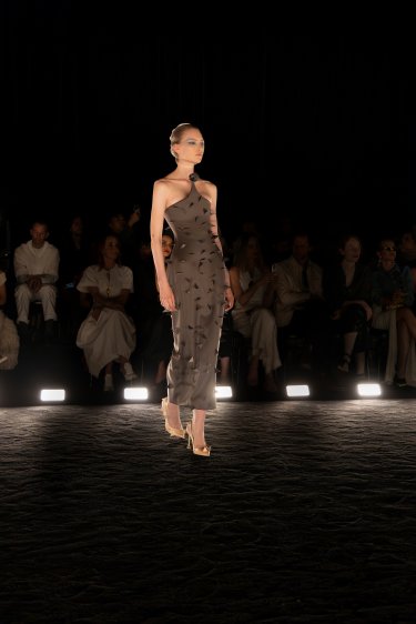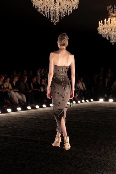 Robe bustier en satin de laine marron glacé ornée de broderies épines 3D ton sur ton et d’une broderie bouton de rose en satin au niveau du col. La ligne du bustier est inspirée d’un soulier vintage.